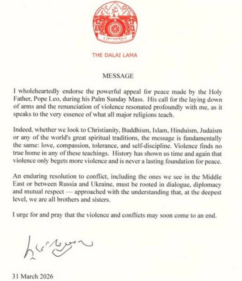 The Dalai Lama’s message calls for peace, compassion, and dialogue.